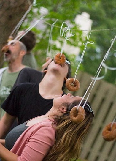 - La actividad consiste en el típico juego de las “donas colgantes” donde los niños deben de competir entre ellos para comer la dona que les corresponde sin usar sus manos y poder devorarla por completo.